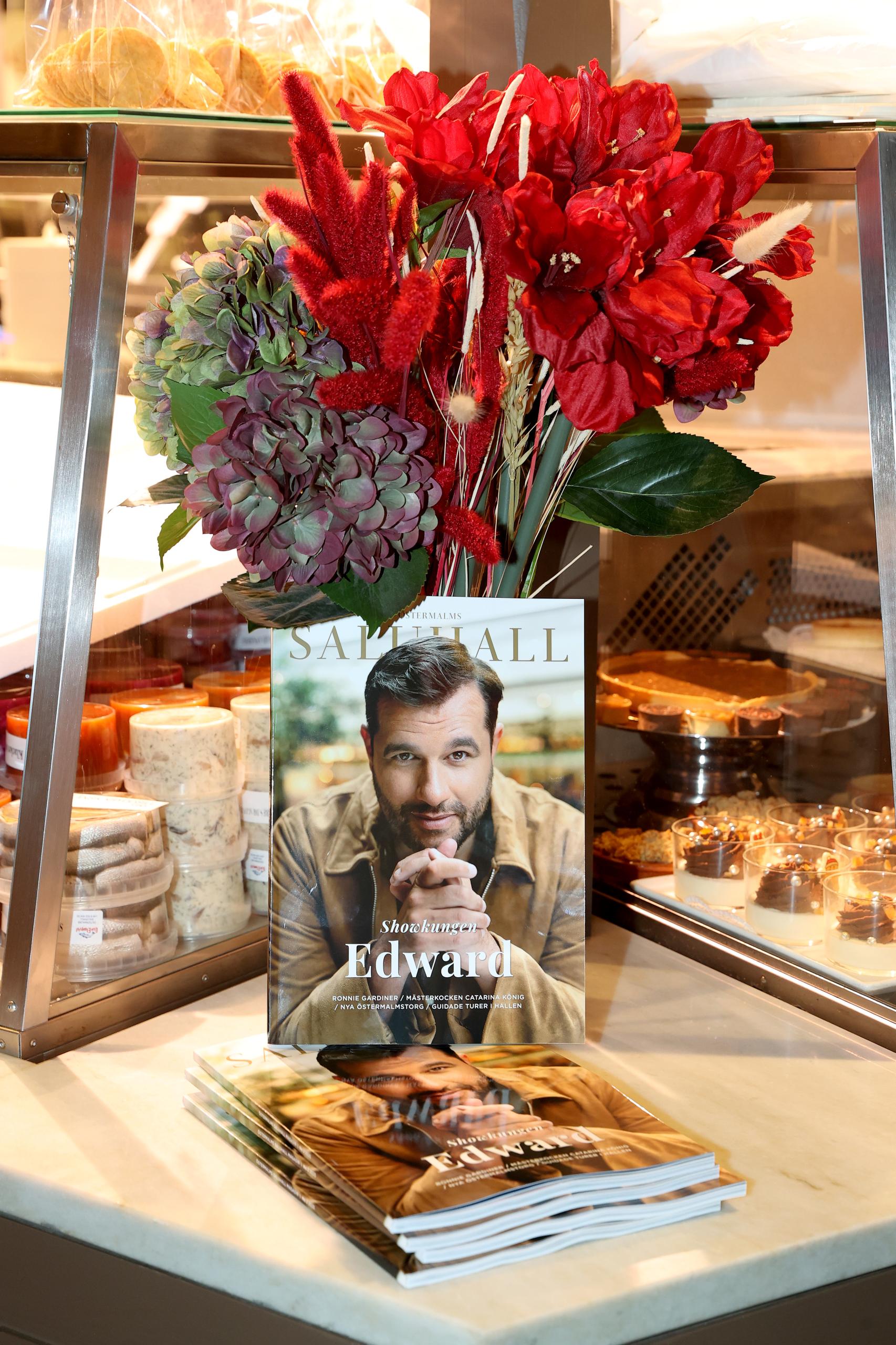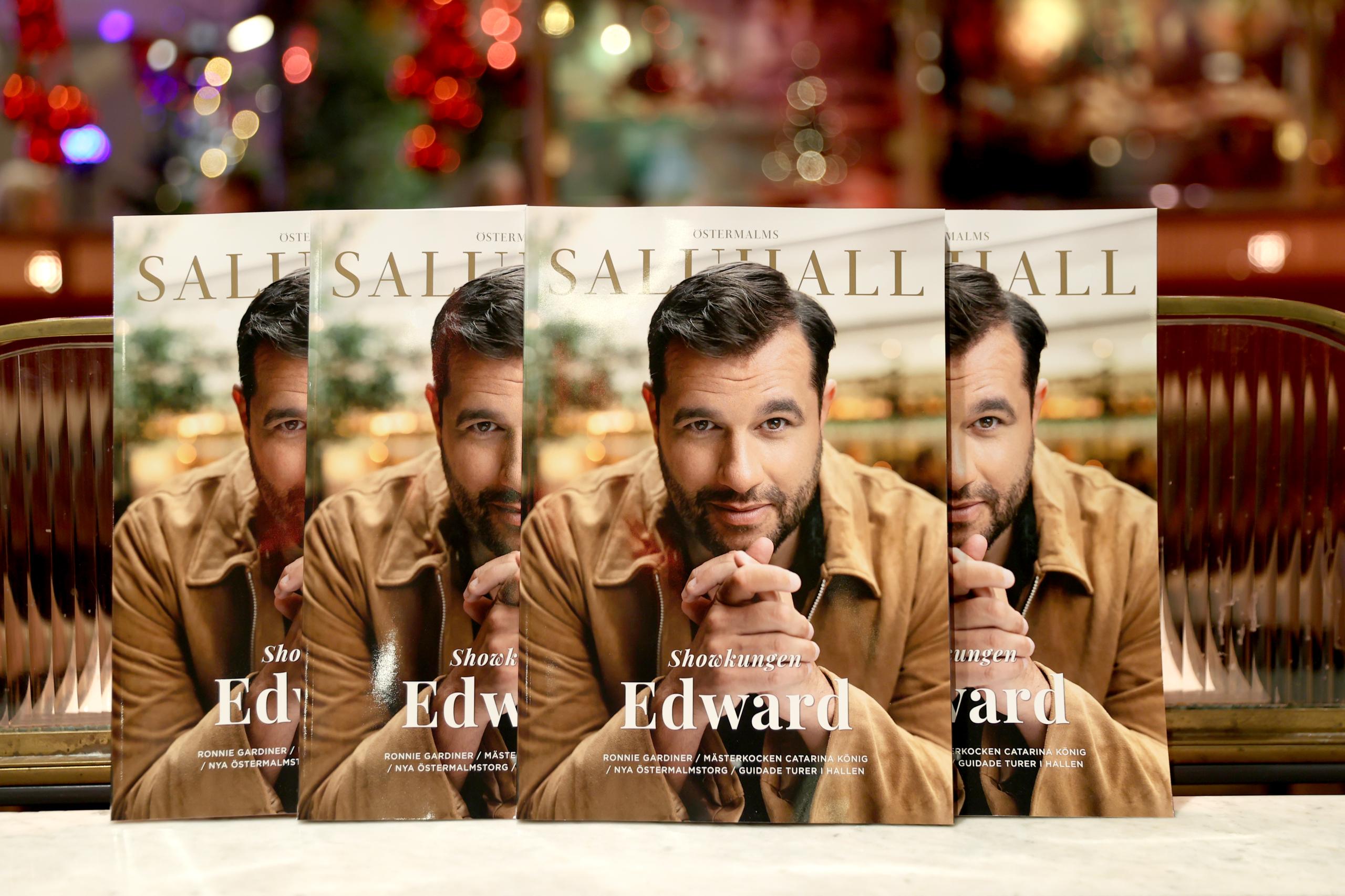 Kvällens värdinna, chefredaktör Lina Bielsten, startade Östermalms Saluhall Magasin för 15 år sedan. Här med senaste numret som pryds av showkungen Edward af Sillén.