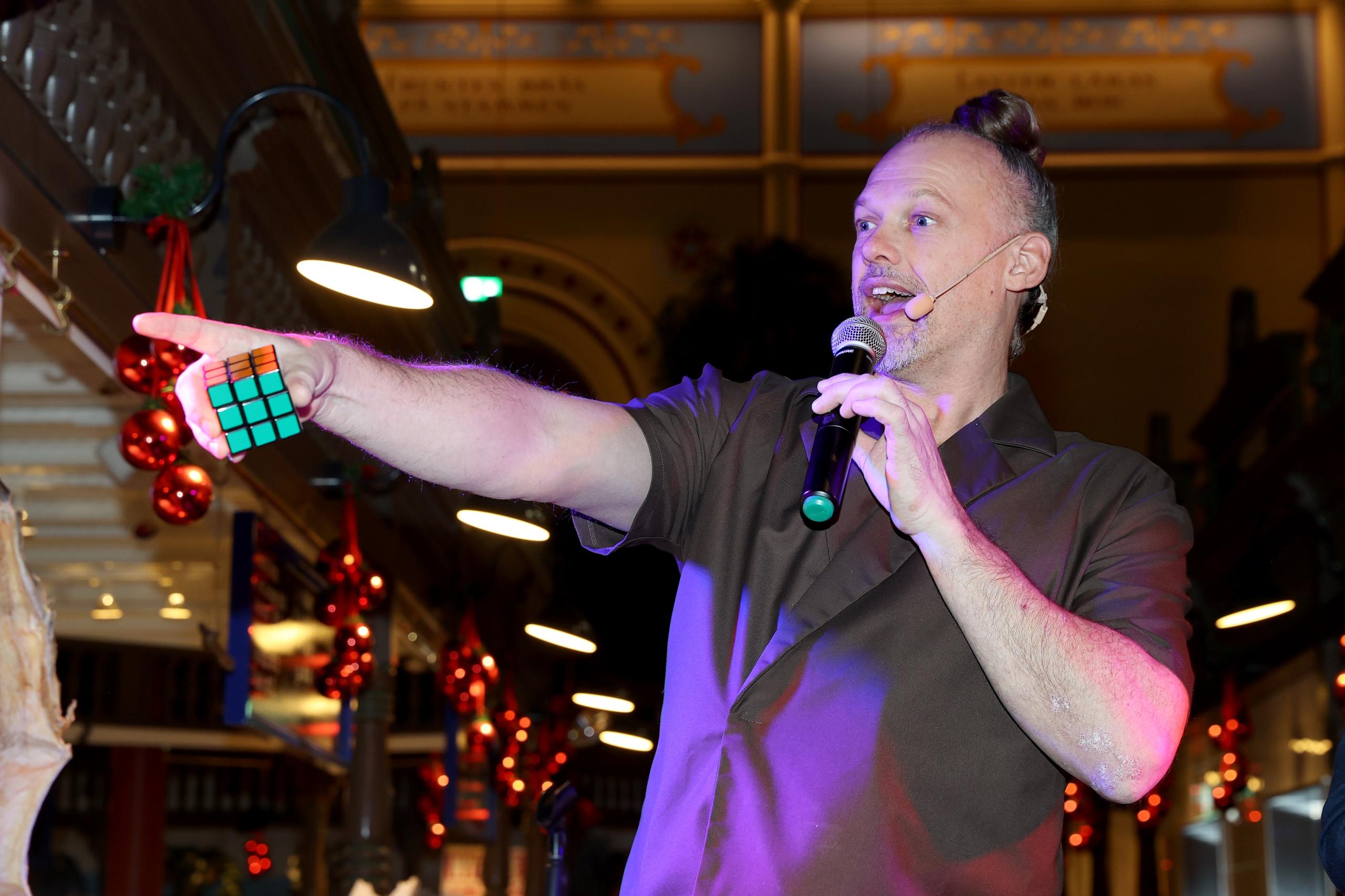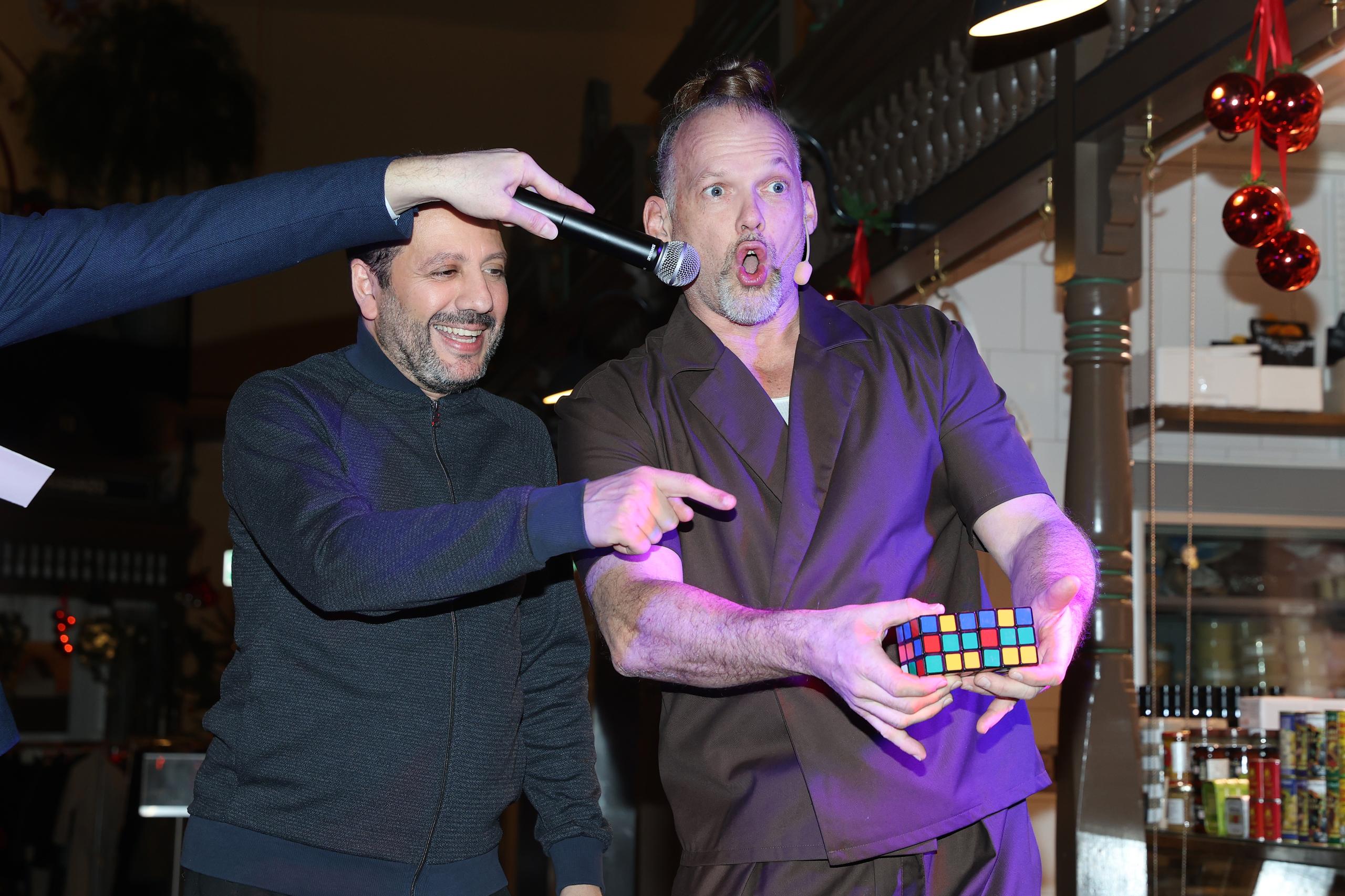 Illusionisterna Brynolf & Ljung körde ett trick med kvällens gäster i saluhallen.